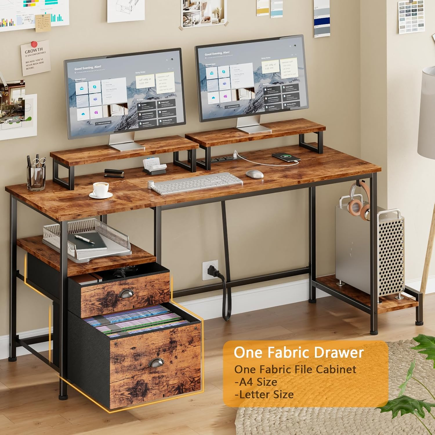 - [More Storage Capacity Desk]: 47″ computer desk with a file cabinet and 2 monitor stands, provids you plenty of storage room for your books, working documents; additional two hooks on side, you can place backpack, headphone, etc. space saving and making your tabletop more organized.