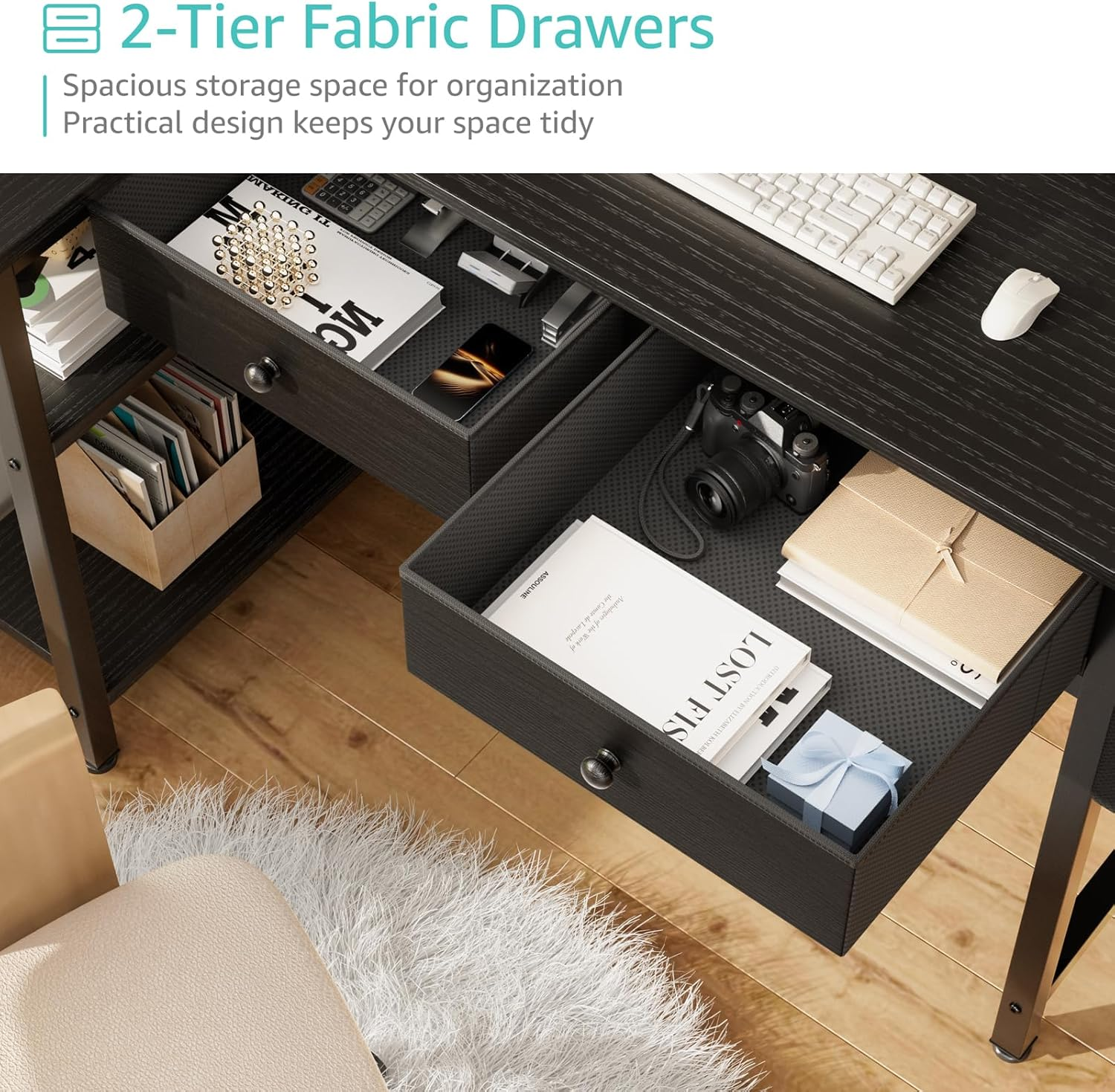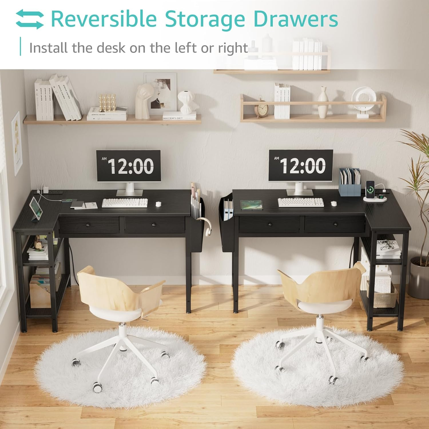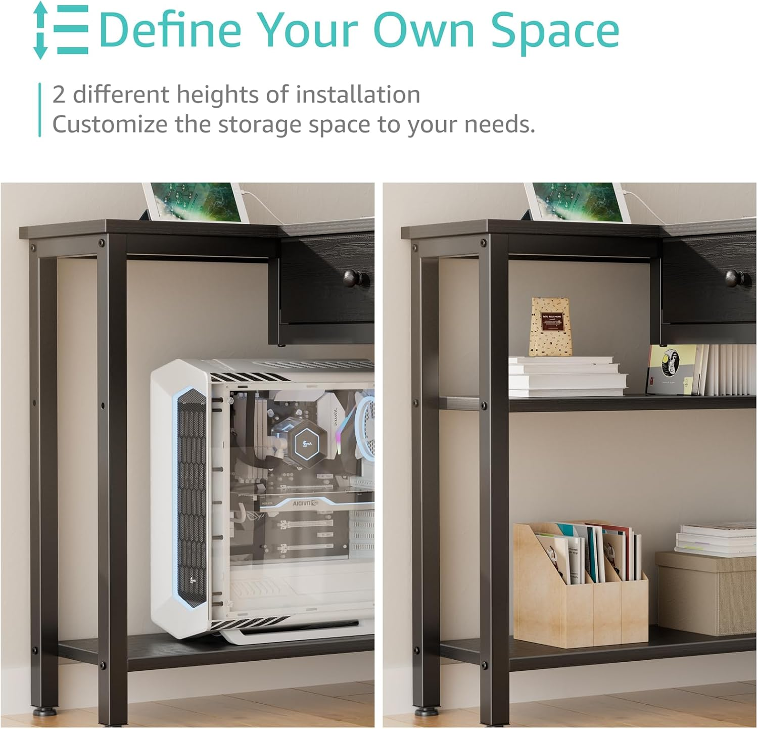 - Modern Simple Style Design: Computer desk with 2 storage shelves and 2 ππππ§ππ πΏπ§ππ¬ππ§π¨ with wooden front, you can try this two installation methods (left or right), and the shelves have two different heights of installation, you can customize the storage space to your needs. This desk is made of thick P2 particle wood board with scratch-resistant, anti-collision and waterproof, protect home office desk surface from daily wear and tear