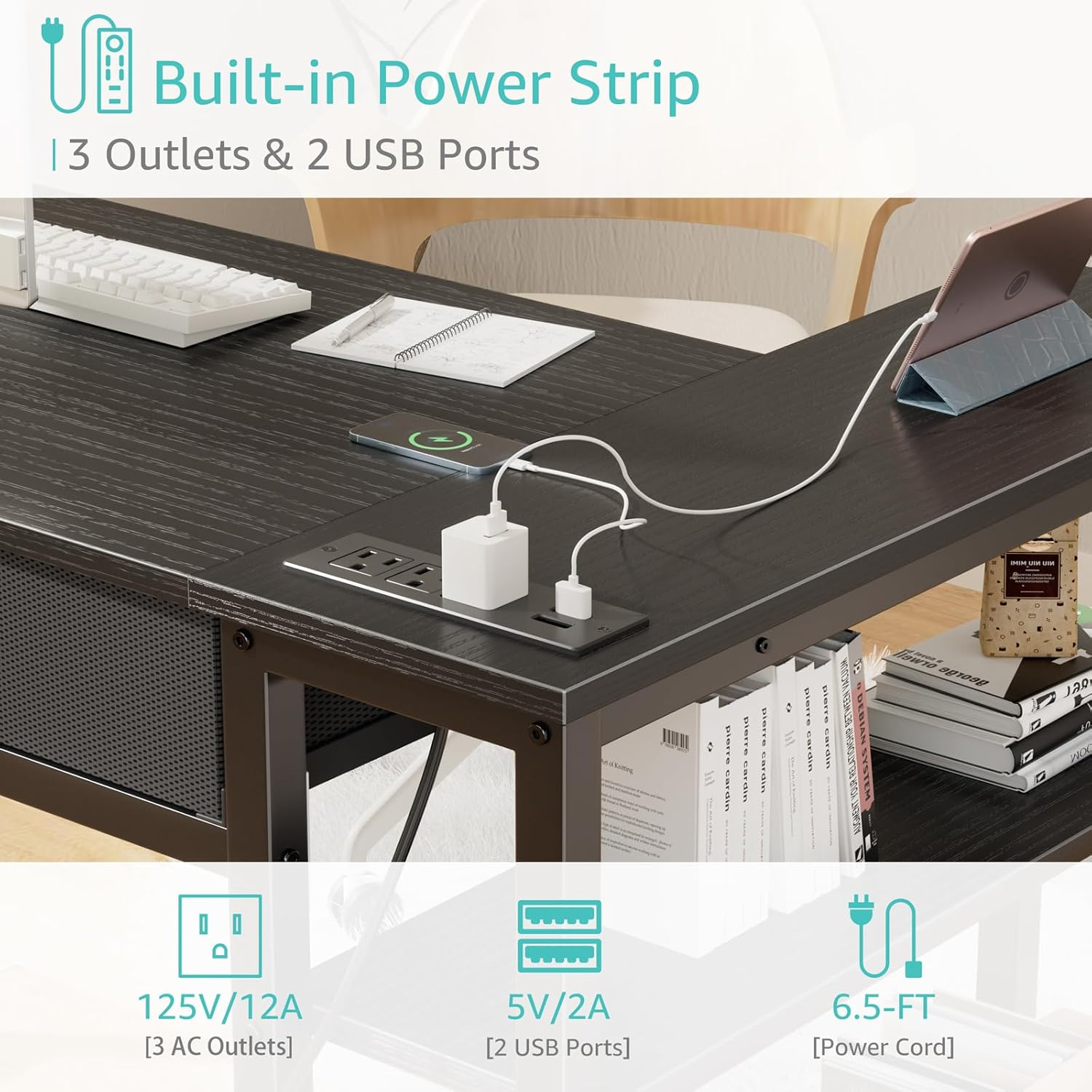 - Safety Multifunctional Power Strip: The computer desk includes a built-in power strip with 3 power outlets & 2 USB charging ports for your computer, monitor, gaming gear, pad, phone and other electronic devices