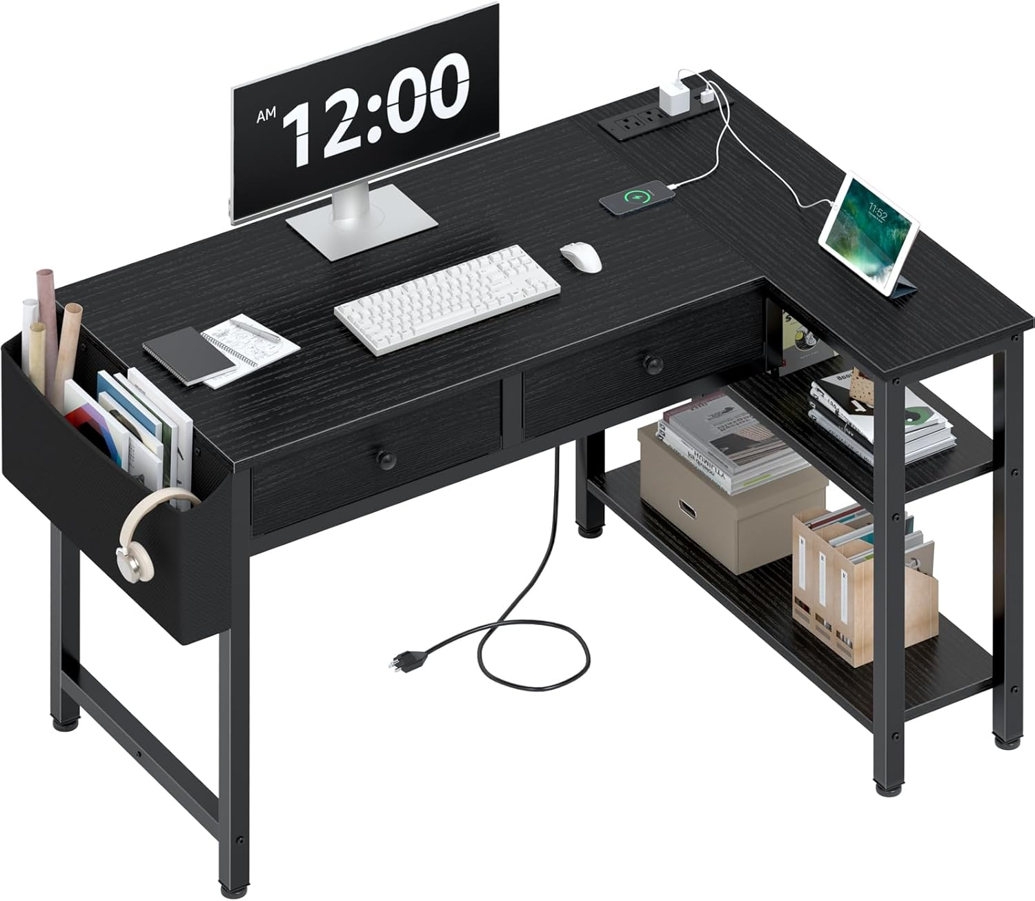 Black Corner Desk for Small Space with Drawers, Reversible Gaming L Shaped Computer Desk with Storage Shelves for Kids Boys, Corner Work Study PC Desks for Bedroom